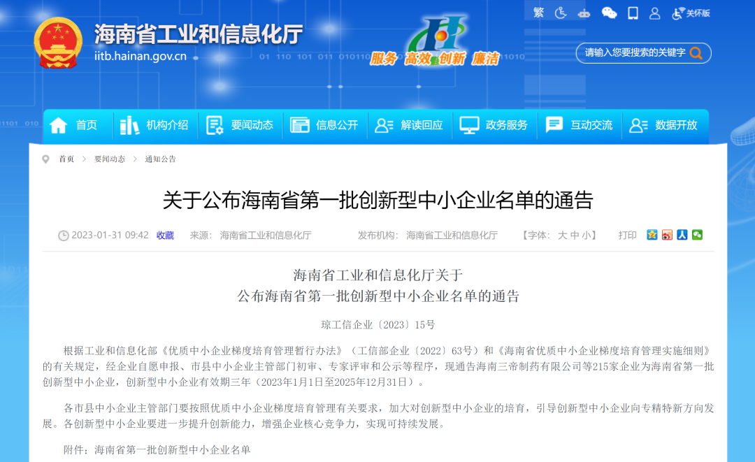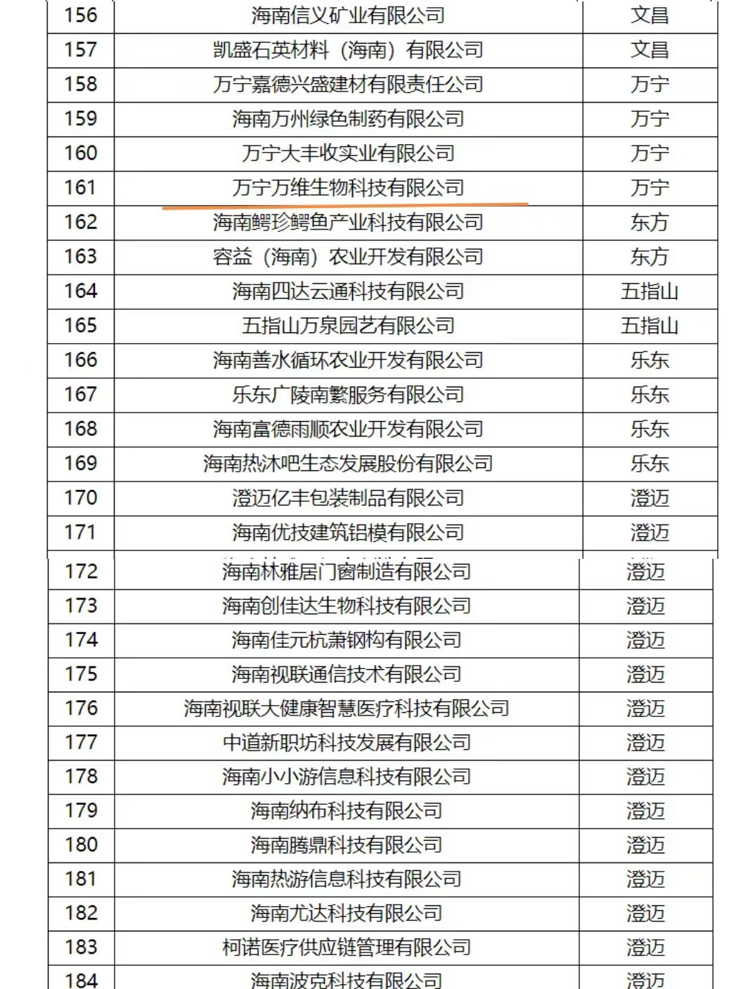 近日,海南省工业和信息化厅公布了海南省第一批创新型中小企业名单,我司的全资子公司万宁万维生物上榜。