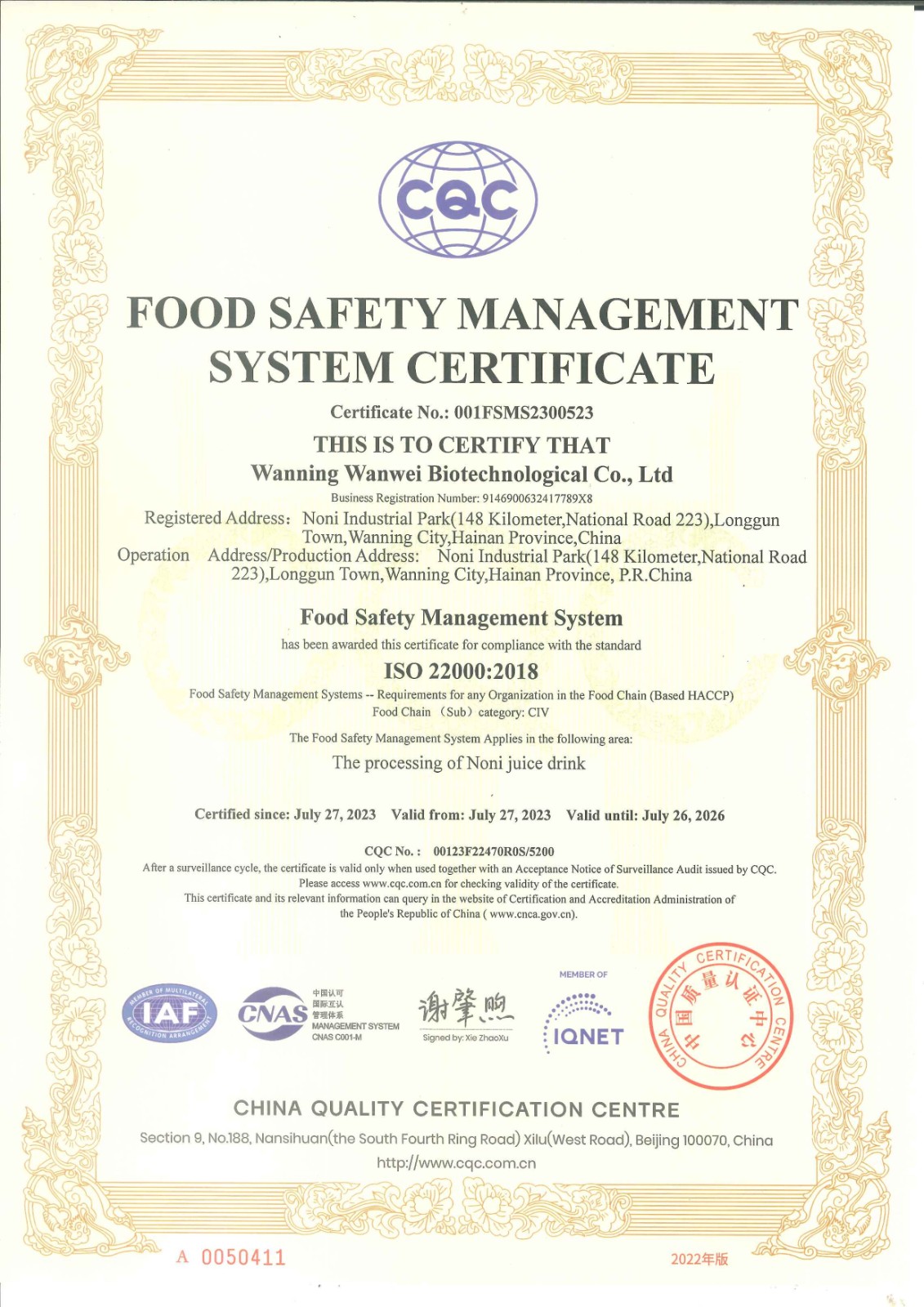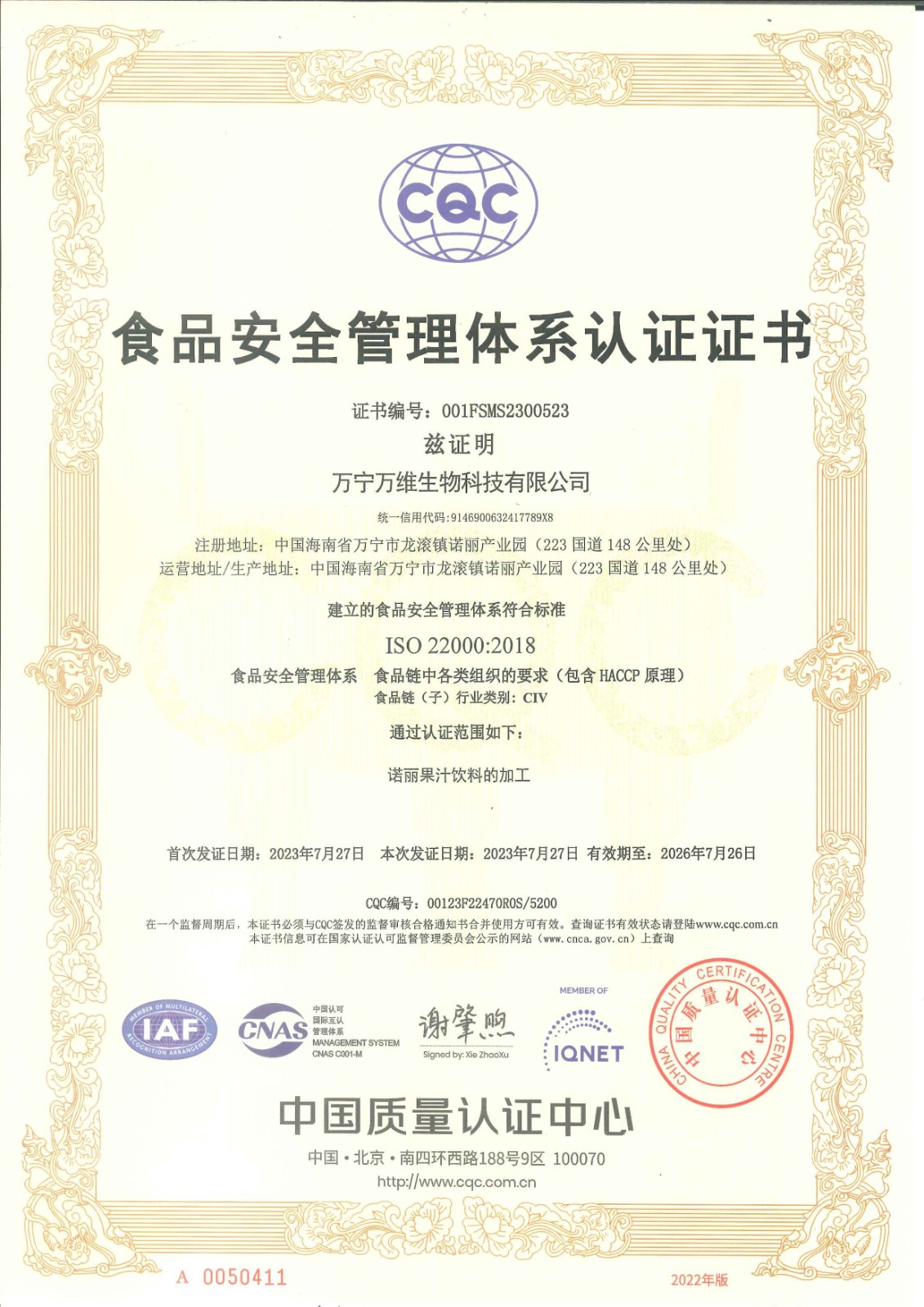 近日,万维生物收到中国质量认证中心颁发的食品安全管理体系认证证书(证书编号:001FSMS2300523)。本次认证,是继公司获得出口备案认证后的又一次国家级质量认证,该认证也标志着万维生物建立的诺丽产品加工食品安全管理体系符合ISO22000标准。